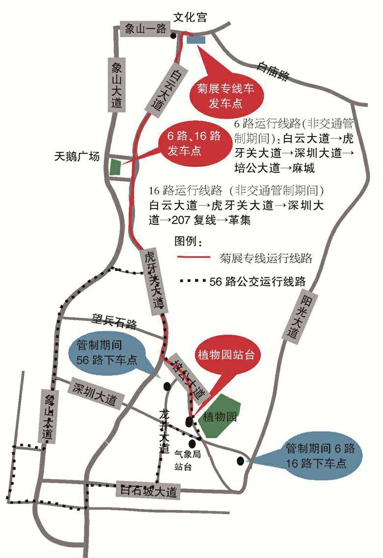 值得說(shuō)明的是,菊展期間,公交按現(xiàn)行票價(jià)收費(fèi)。菊展前三天,深圳大道東端、培公大道(培公大道與龍井大道交叉路口至培公大道與白石坡大道交叉路口)將實(shí)現(xiàn)交通管制,禁止公交車(chē)通行,這樣一來(lái),上述四條公交在植物園附近的線路和停靠站點(diǎn)將同步調(diào)整,菊展專(zhuān)線公交車(chē)將停靠在培公大道植物園出口,其他時(shí)間??吭谥参飯@大門(mén)附近的植物園站臺(tái)。交通管制期間,16路公交車(chē)、6路公交車(chē)將??吭诎资麓蟮罇|上下車(chē)。56路交通管制期間線路不延伸,在培公大道與龍井大道交叉路口上龍井大道,游客可在龍井大道北段上下。荊門(mén)晚報(bào)訊(記者戴永君)
